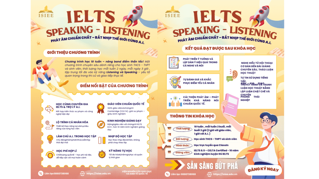 Từ giữa tháng 6/2025, chương trình Lớp hè IELTS Listening – Speaking kết hợp A.I. đã chính thức bắt đầu và hiện đang diễn ra vô cùng sôi nổi. Đây là chương trình do Viện ISIEE kết hợp với Trung tâm GDTX TP. Vĩnh Long triển khai dành riêng cho học sinh THPT và sinh viên có định hướng chinh phục IELTS và nâng cao kỹ năng tiếng Anh học thuật.